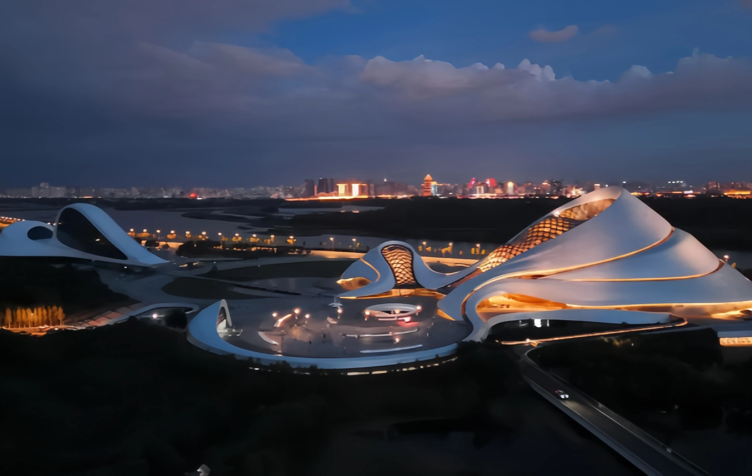 - Curved Exterior: The building’s wave-like form reduces wind resistance and integrates with the riverfront landscape.