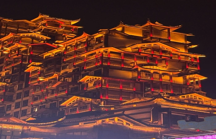 Ночное освещениеВ сумерках здания загораются красочными светодиодными дисплеями, зарабатывая им прозвище"Долина Радуги Чжанцзяцзе. "