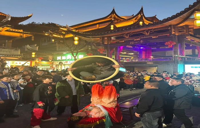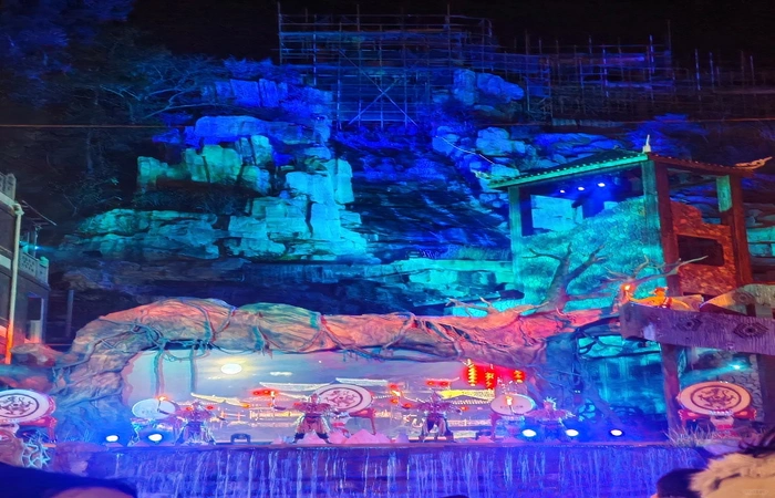 200-метровый пешеходный мост в форме змеиного дракона с чешуей из отражающего металла. Пройдите через него, чтобы достичьМузей народной культуры Туджиякоторые носят традиционные костюмы и ремесла.